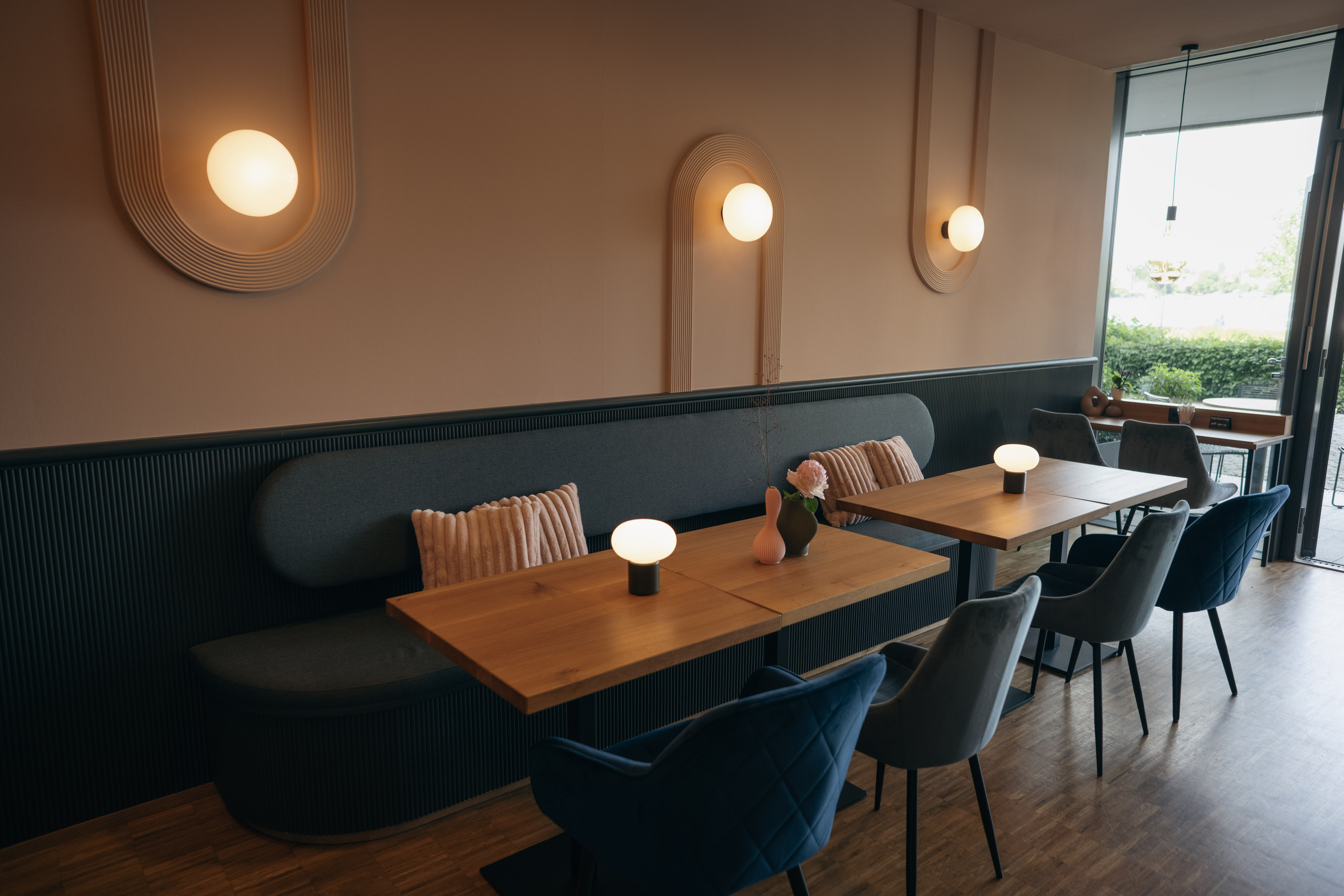 Der Gastraum der Hotelcafés in der Potsdamer Schiffbauergasse sollte einen neuen Look bekommen. In Anlehnung an das Branding des Boarding House spielte das Motiv der Welle eine zwar wichtige, jedoch nicht zu plakative Rolle. Zudem stand im Fokus, eine Handschrift zu schaffen, die sich im späteren Verlauf auch auf die Gestaltung der Hotelzimmer übersetzen lässt.
